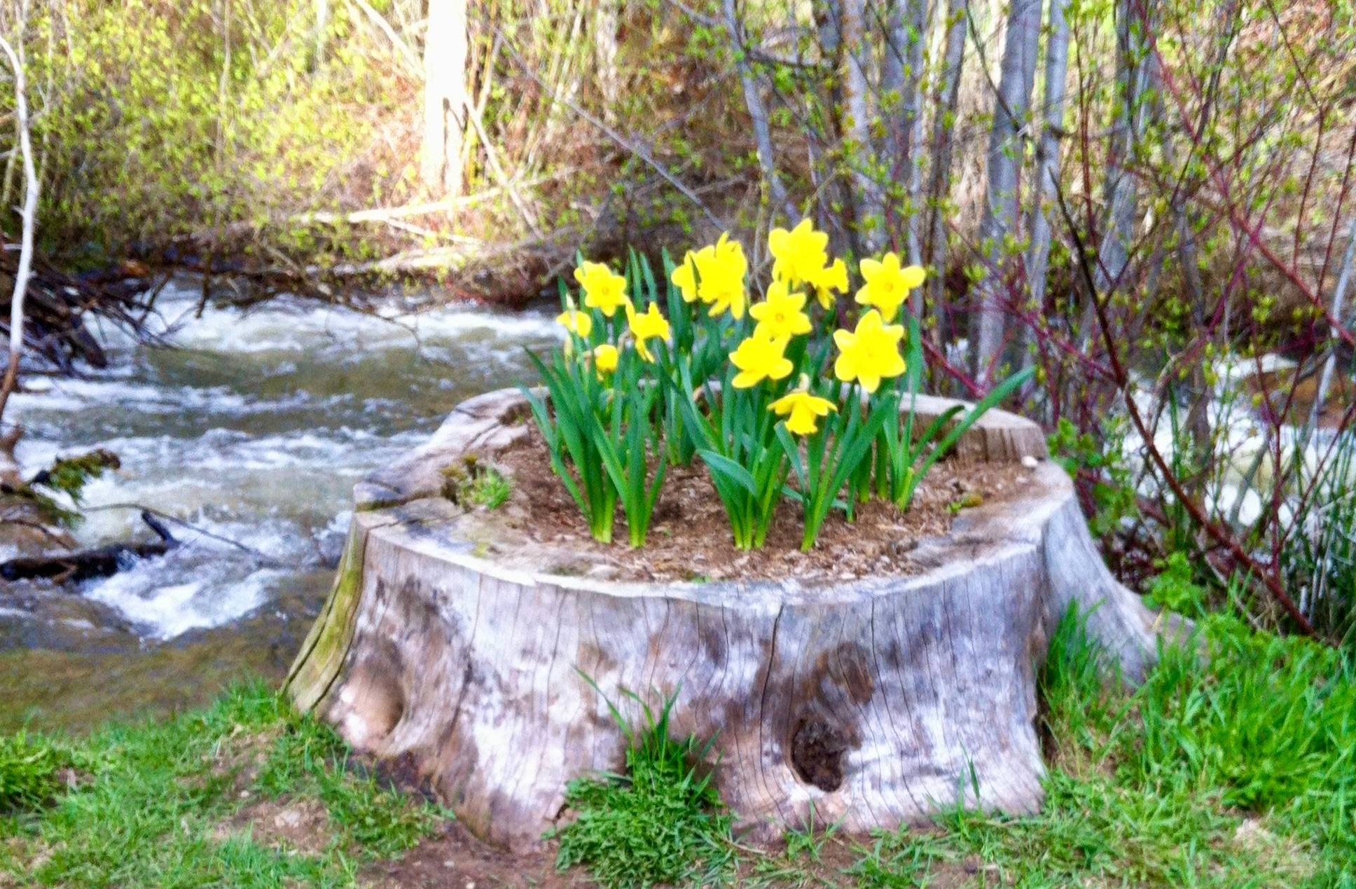 The above photo is from an old smartphone, hence the blur. But I love the way someone decided to reuse the stump as a planter for daffodils, those bright heralds of spring